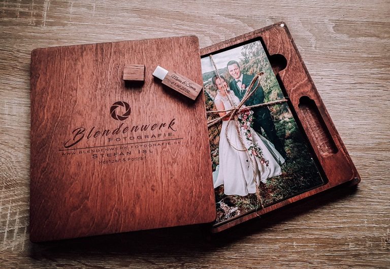 Als Hochzeitsfotograf lege ich großen Wert auf die Erinnerungen, die ich für Paare festhalte. Um diese besonderen Momente zu bewahren, biete ich ihnen personalisierte USB-Sticks und wunderschön gravierte Holzboxen an. Bei Buchungen ab 8 Stunden erhalten die Paare nicht nur professionell gedruckte Bilder, sondern auch einen einzigartigen USB-Stick, der mit ihrem Namen und dem Hochzeitsdatum graviert ist. Diese liebevoll gestalteten Holzboxen sind nicht nur ein dekoratives Element, sondern auch eine besondere Aufbewahrung für die Erinnerungen ihres großen Tages. Lassen Sie uns gemeinsam Ihrer Hochzeit einen unvergesslichen Rahmen geben!